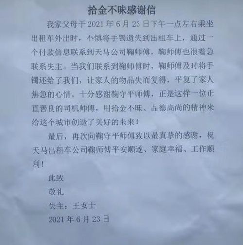 拾金不昧是中華民族的傳統(tǒng)美德,既是主流價(jià)值觀倡導(dǎo)“品德修養(yǎng)·潔身自愛”的人文瑰寶,更是華夏兒女傳承的非物質(zhì)文化遺產(chǎn)。2021年6月23號(hào),一位老人在乘坐我們泰安旅汽天馬出租公司鞠守平師傅的出租車時(shí)不慎將拿去清洗的金手鐲遺落在車上。事發(fā)后,鞠師傅聯(lián)系不上失主,馬上將乘客遺失的物品交回公司,天馬出租公司劉經(jīng)理?yè)?dān)心失主著急,經(jīng)過多方聯(lián)系以及泰安市交通局出租辦的幫助,終于聯(lián)系上了正在著急的老人,并將物品歸還給失主。失主感動(dòng)不已,說天馬出租的鞠師傅有一顆金子般的心,并委托朋友為鞠師傅送來了感謝信和錦旗。